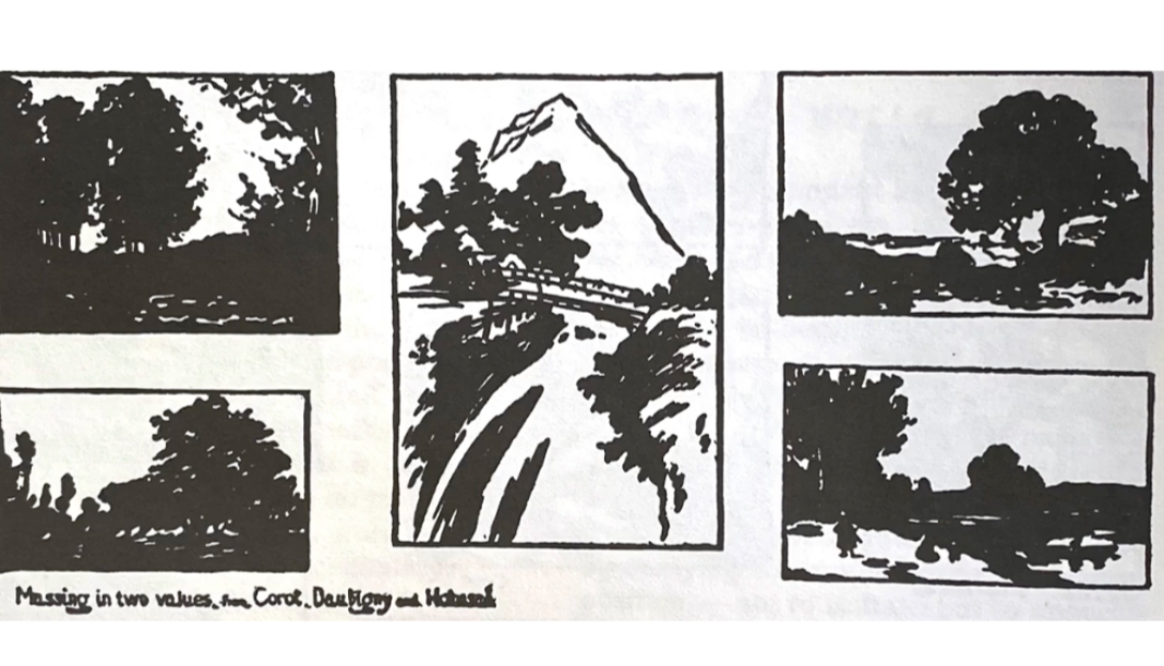 Skip treats notans as planning tools — not optional exercises. By reducing a scene to simple value relationships, artists can immediately see whether a composition will succeed.